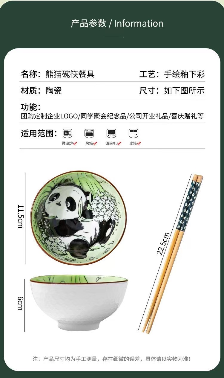 6碗筷套装:规格:36.5*6*24.5cm、 外箱尺寸75*35*49CM28.5kg、配法:6碗6筷 产品特点: 国宝熊猫碗,可爱有趣的熊猫,精致好看的礼盒装,让人爱不释手,是送礼(特别是家里有小孩的)佳品哦。 餐具整理厚实防烫,久经耐用,釉面光滑,清洗方便!