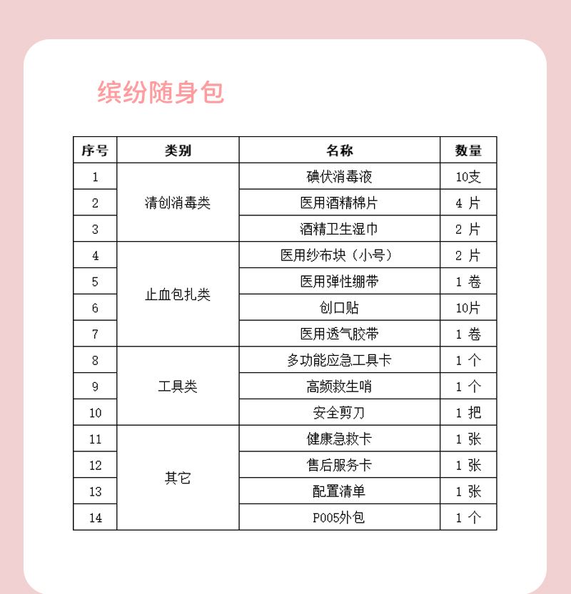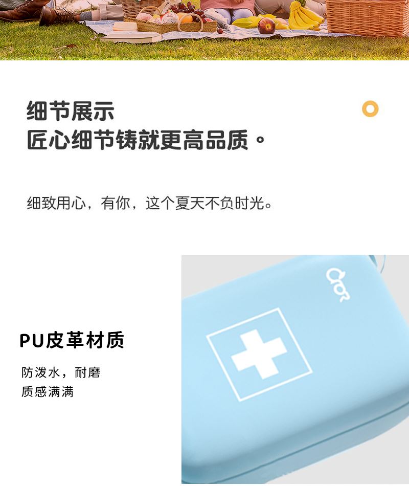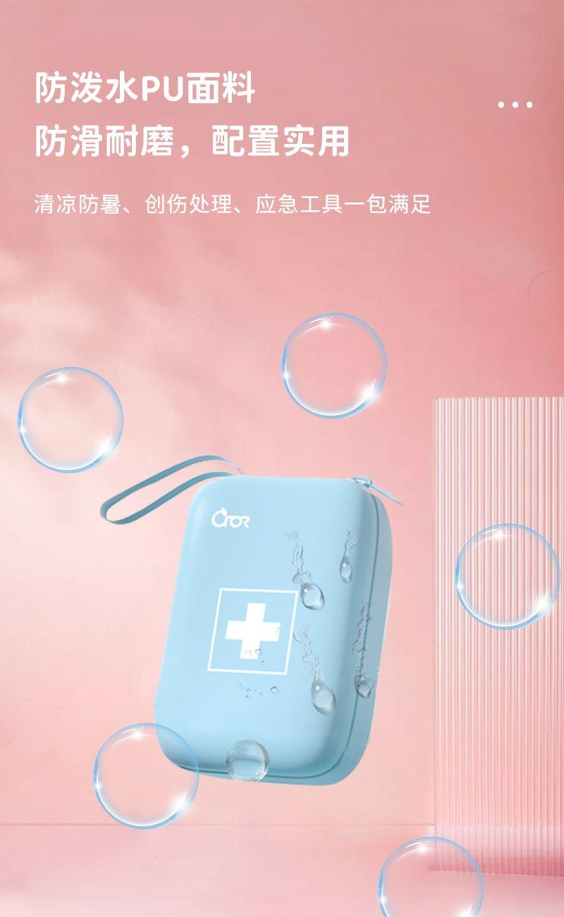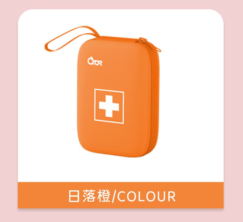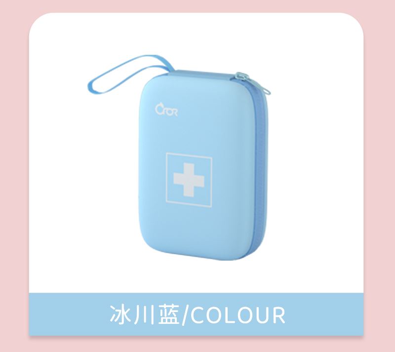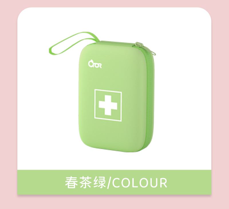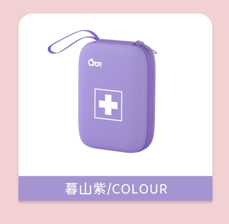 产品材质:PU革覆EVA 产品规格:145*100*45mm 产品颜色:暮山紫、冰川蓝、日落橙、春茶绿 产品配置:含4大类14种急救用品