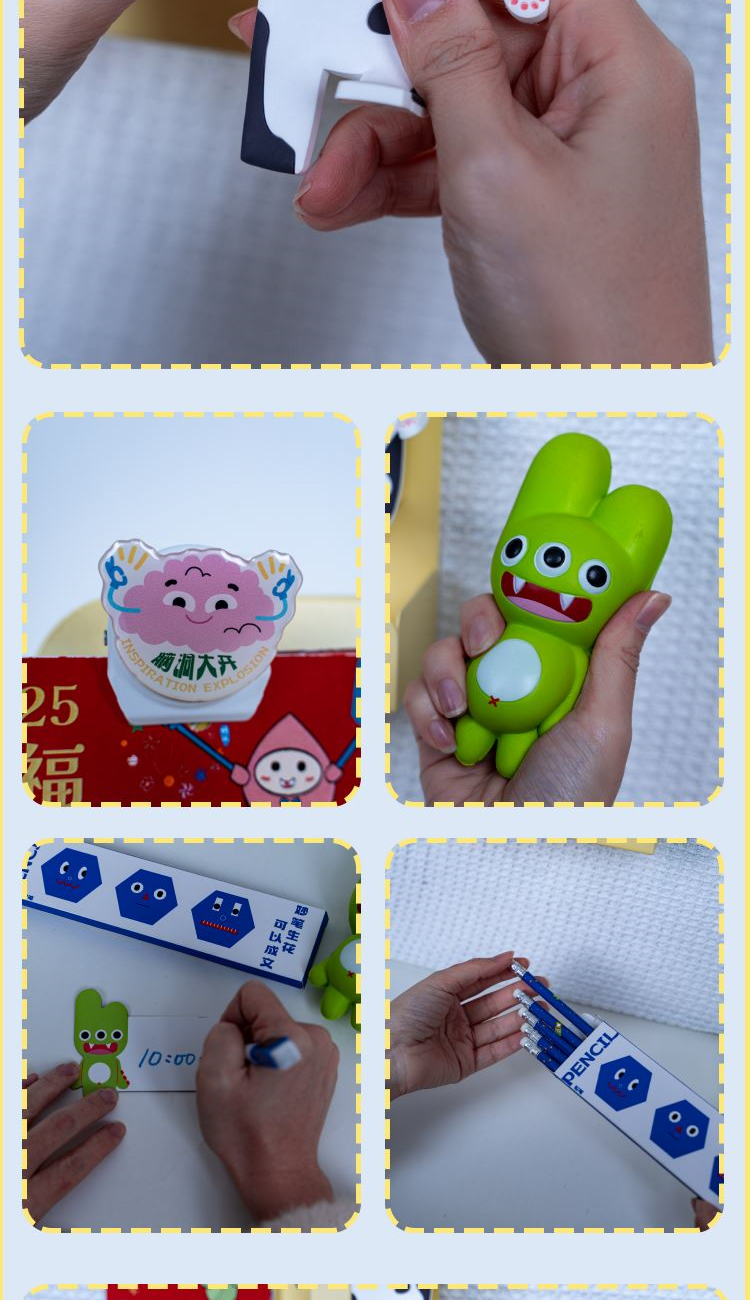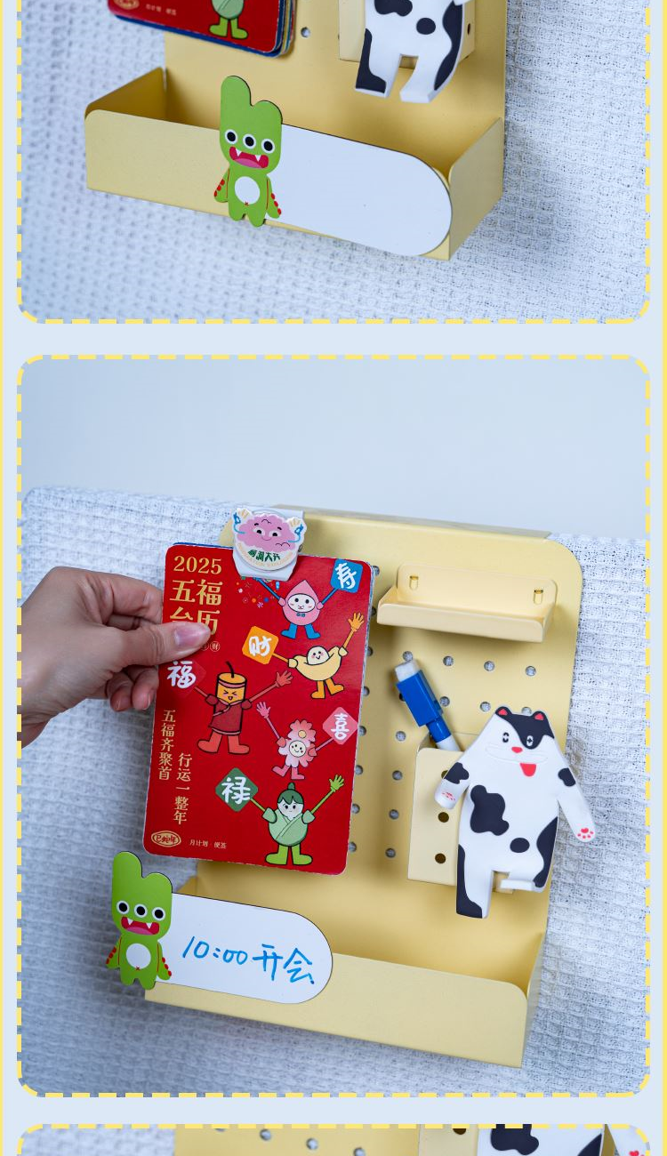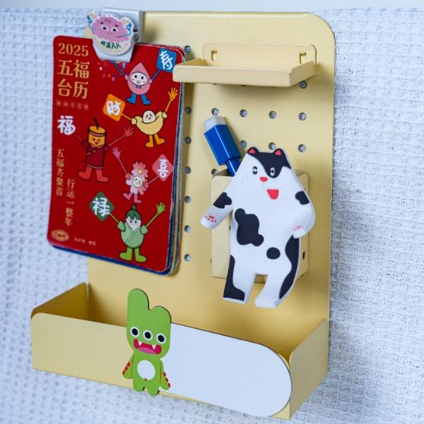 桌面洞洞板*1 23cm*18cm (山影蓝/奶黄色) 挂件笔筒*1 6.5cm*5cm 磁铁夹子*1 3.5cm*3cm 记事月历*1 10cm*15cm 13张 免钉小层架*1 7.5cm*4.5cm 磁吸白板+白板笔*1 11cm*6.5cm 包装盒尺寸:27.5*23.3*10.5cm