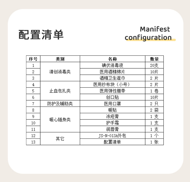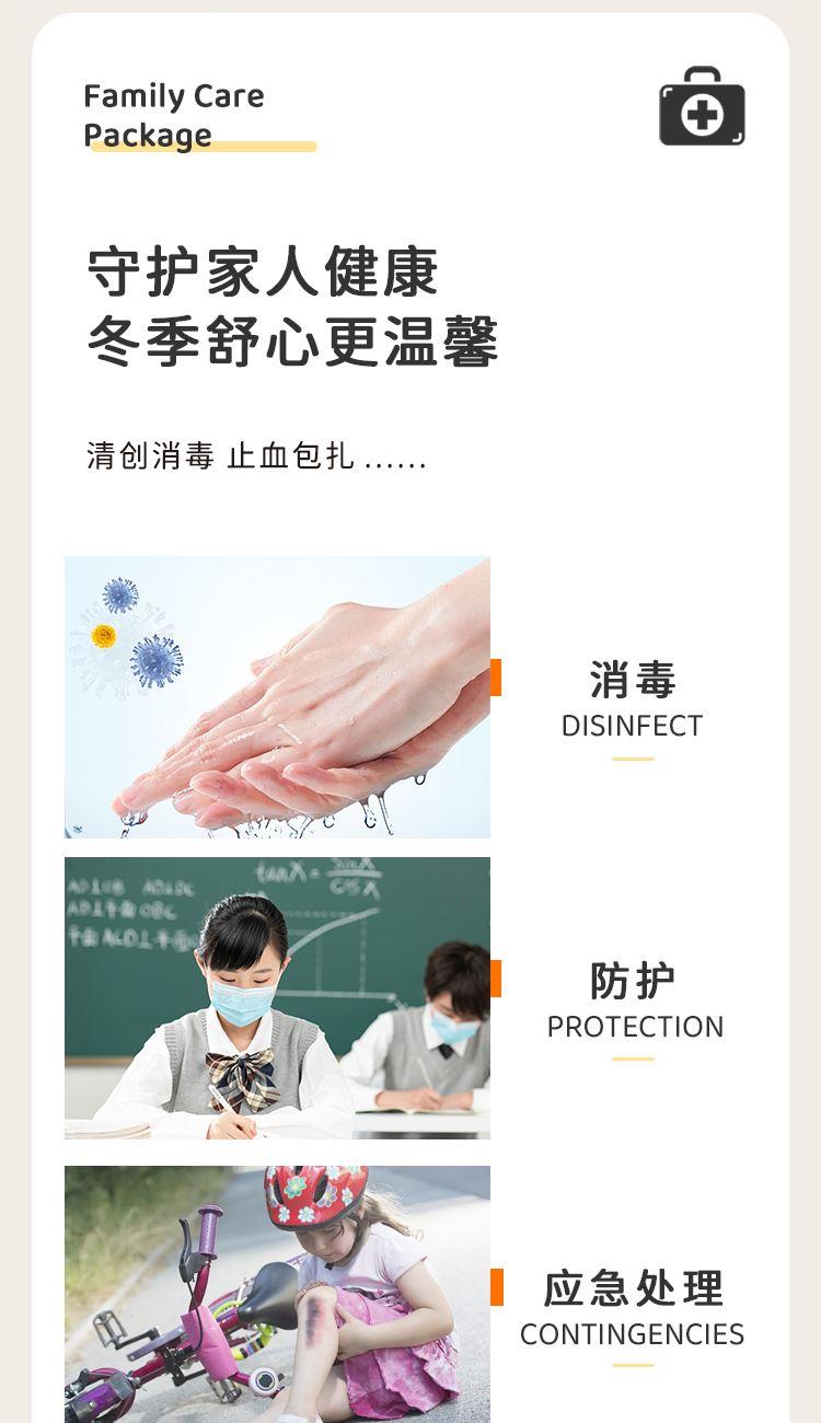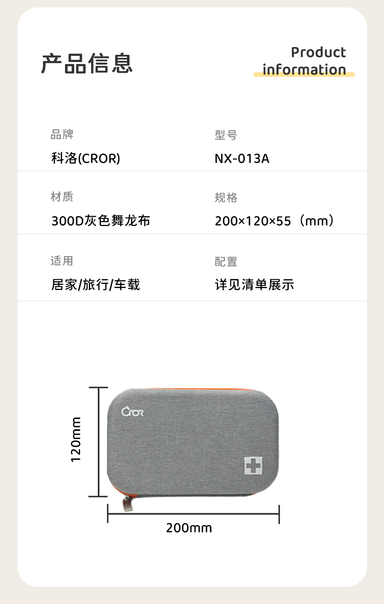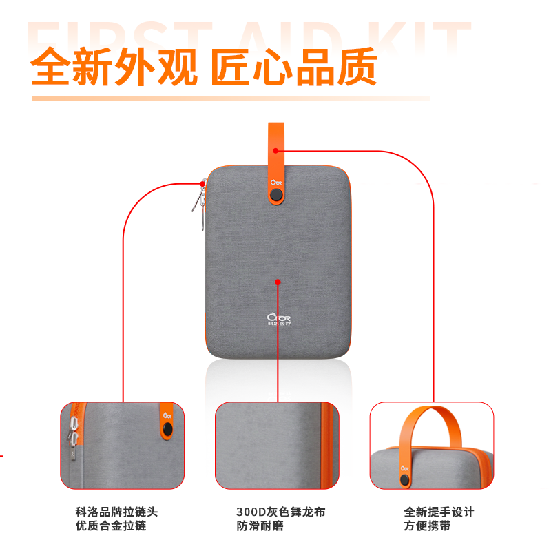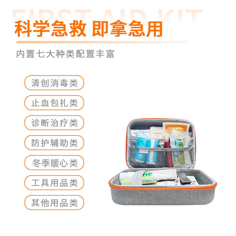 产品材质:300D灰色舞龙布(属牛津布) 产品规格:240*180*100mm 产品颜色:月影灰 产品配置:含7大类29种急救用品