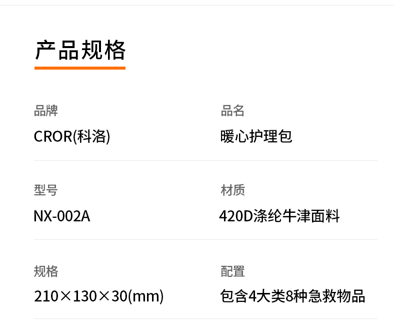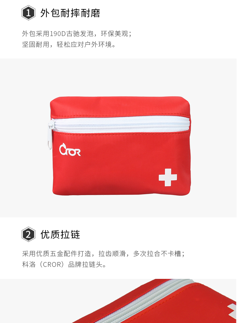 产品材质:190D发泡尼龙 产品规格:210*130*30mm 产品颜色:红色 产品配置:含8种急救用品